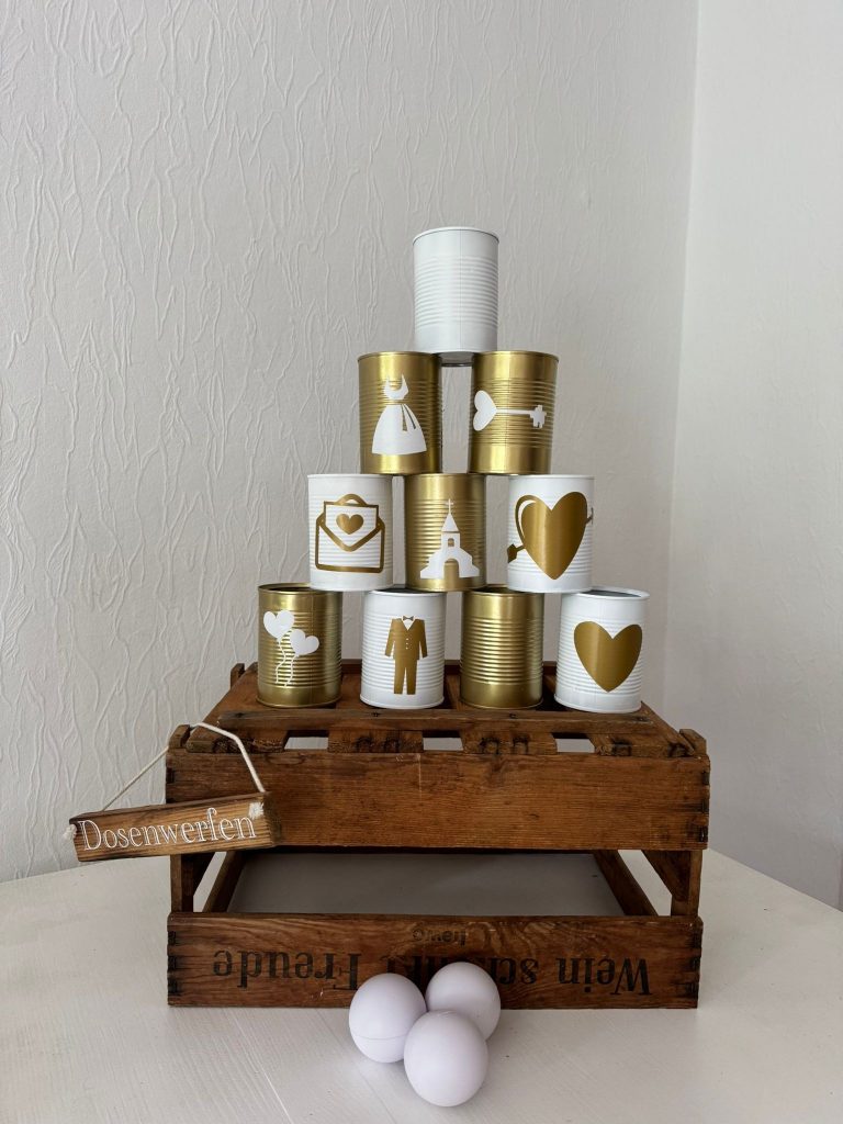 Zusatzinfo: 1 Stück im Bestand, inklusive Weinkiste, Dosenwerfen Schild und 3 Bälle