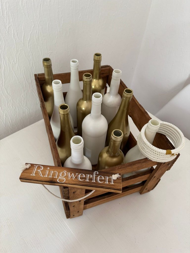 Zusatzinfo: 1 Stück im Bestand, 12 Flaschen inklusive Weinkiste, Ringwerfen Schild und 6 Ringe